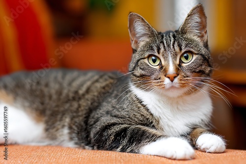 A tabby cat with white chest and paws rests comfortably on an orange surface, looking directly at the viewer.