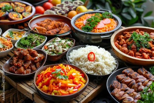 A table is covered with a bamboo mat and overflowing with bowls of food