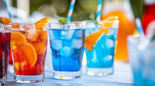 A table with a variety of colorful drinks, including a blue drink with a straw. Tropical summer concept