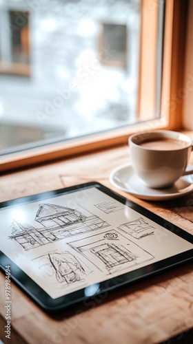 A tablet displaying a house sketch with a cup of coffee on a wooden table by a window.