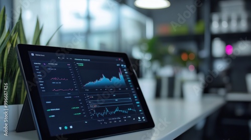 A tablet displaying financial data and graphs in a modern office environment.