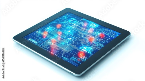 A tablet showing a digital history textbook with interactive timelines and maps, symbolizing education technology, isolated on a clean white background.