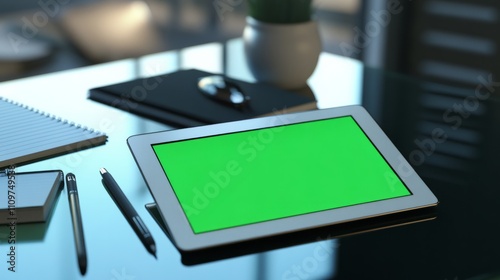 A tablet with a green screen displayed on a minimalist glass desk, beside a stylus and notebook