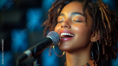 A talented artist passionately sings into a microphone, sharing joy and emotion