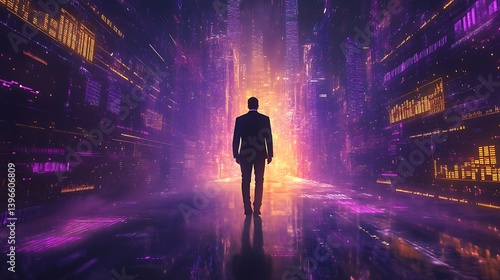 A tall executive in a dark suit stands centered in a glowing white digital space, with purple and yellow holographic trading data and urban city blueprints streaming through his silhouette,