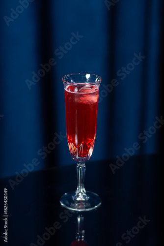 A tall glass filled with a bright red cocktail with ice cubes, placed on a reflective black surface with a dark blue background