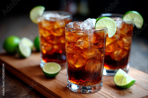 A tall glass of Cuba Libre cocktail with lime wedge and ice cubes on rustic wooden table