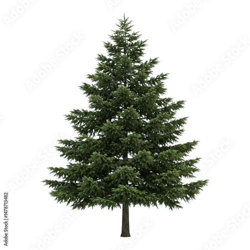 A tall, lush coniferous tree stands prominently against a bright white backdrop, visually striking.