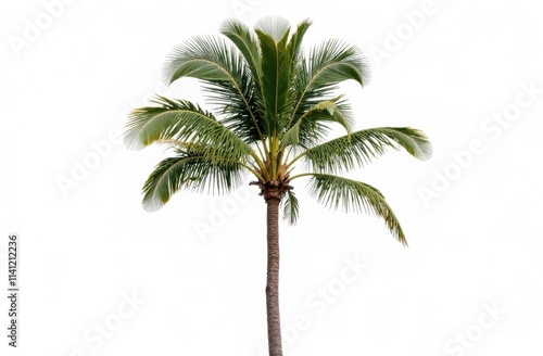 A tall palm tree stands prominently, showcasing its vibrant green fronds. The simple backdrop highlights the tree's unique structure and natural beauty, capturing the essence of tropical flora.