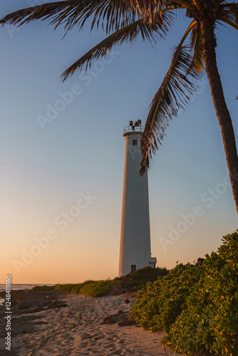 A tall white lighthouse stands near a sandy beach, surrounded by greenery and a palm tree, with the ocean partially visible under a golden sunset.