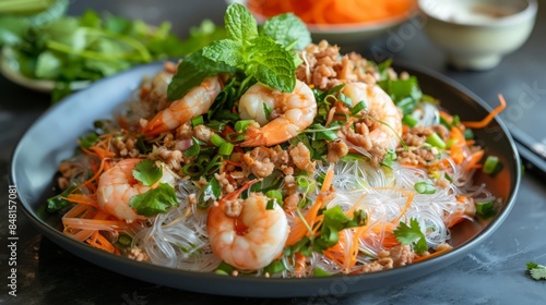 A tangy and flavorful plate of Yam Woon Sen, a glass noodle salad with shrimp, minced pork, and fresh herbs