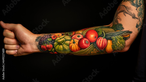 A tattoo-adorned arm proudly displays a cornucopia of fruits and vegetables, celebrating Thanksgiving s abundant harvest, while gently cradling a vibrant tangerine