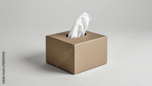 A taupe-colored tissue box sits on a neutral background, showcasing a single tissue protruding from its opening.