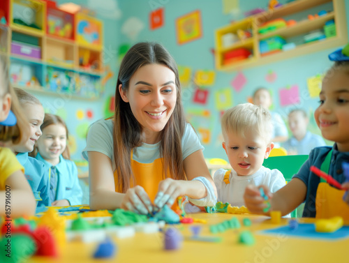 A teacher and young children engaging in creative play with colorful clay in a vibrant classroom, concept of early education. Generative AI