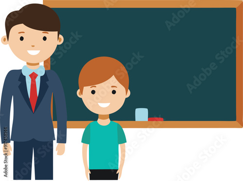 A teacher and young student stand happily in front of a chalkboard.