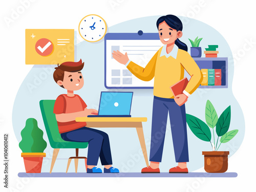 A teacher assists a student with online learning in a bright classroom setting during the afternoon