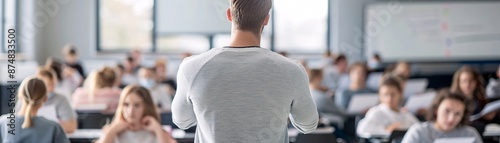 A teacher standing at the front of a modern classroom, giving a lesson to students who are eagerly taking notes, Editorial Photography style