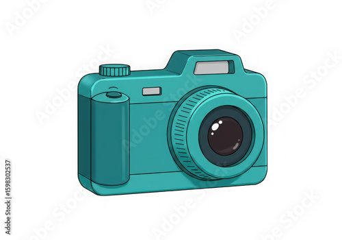 A teal cartoon camera with a large lens is isolated on a transparent background in a