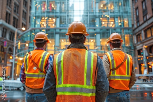 A team of blue-collar workers, dressed in high-visibility orange vests and hard hats, stands proudly in front of a towering city building, representing hard work and determination in the construction