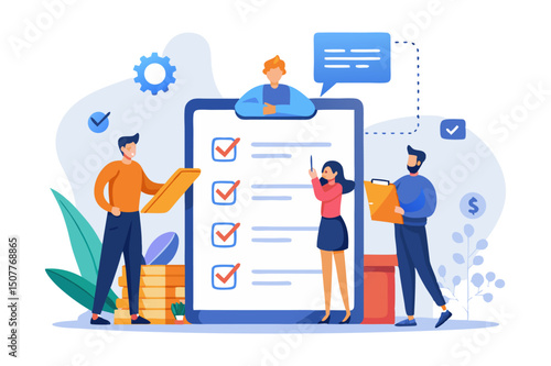 A team of diverse individuals is actively managing a large checklist with completed tasks, surrounded by elements of productivity, finances, and communication.