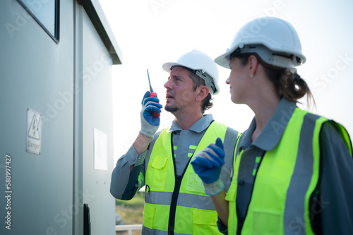 A team of electrical engineers is inspecting an energy storage station of a solar panels in the middle of a hundred acre field of solar panels.