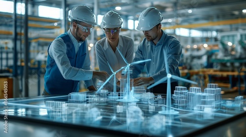 A team of engineers designs innovative solutions for renewable energy production, holographic projection, Green energy concept.