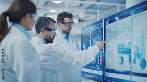 a team of environmental scientists analyzing climate data on a large digital screen in a modern research lab. The screen displays climate models, temperature graphs, and satellite