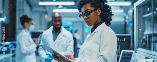 A team of scientists discussing results on a digital tablet in a high-tech laboratory