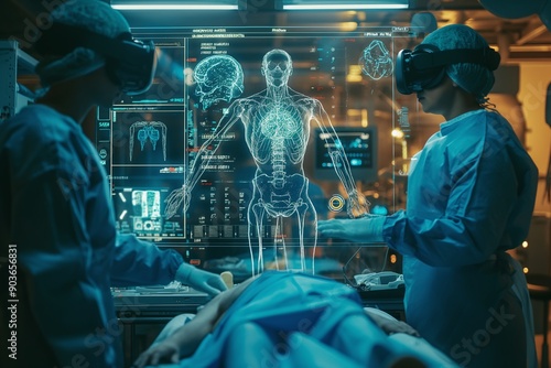 A team of surgeons utilizing augmented reality headsets during a high-precision surgery, with holographic medical data displayed in the operating room