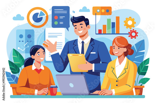 A team of three professionals engages in a sales consulting meeting, sharing ideas around a laptop, Customizable sales consulting illustration.