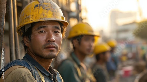A team of workers, their faces illuminated by the warm glow of the setting sun, diligently toiled away on a bustling construction site, their dedication evident in the sweat glistening on their brows.