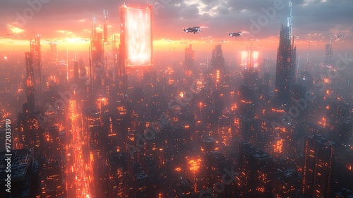 A tech-driven metropolis buzzing with floating drones, glowing holograms, and visible digital networks connecting the city.