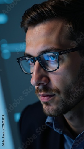 A tech-focused cybersecurity professional with glasses scrutinizing his monitor in shades of blue black and white embodying the realms of mystery security and technological prowess