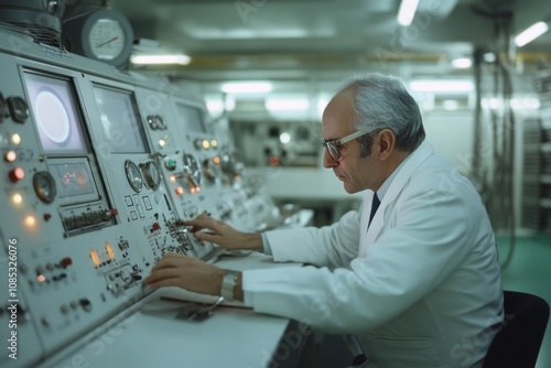 A technician in a white lab coat operates complex equipment in a vintage control room, filled with dials and screens.