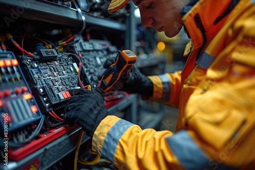 A technician in a yellow jumpsuit works on a complex electrical system. He uses a digital multimeter to diagnose the problem.