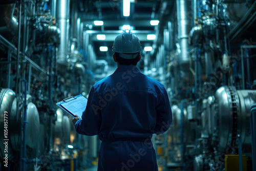 A technician inspects equipment in a dimly lit industrial facility, embodying diligence and responsibility. The atmosphere highlights the complexity and importance of modern engineering processes.