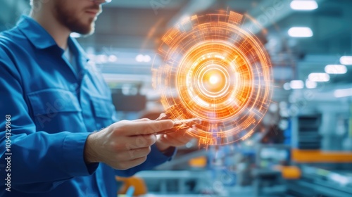 A technician interacts with digital technology in an industrial environment, showcasing innovation and expertise in modern manufacturing.