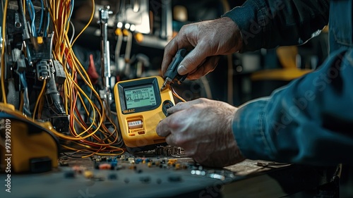 A technician using a multimeter to test electrical circuits in a workshop filled with tools and wires.
