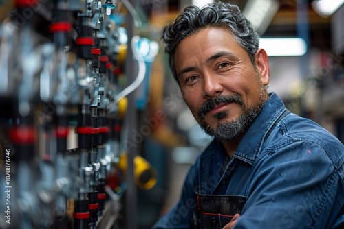 A technician with a beard smiles confidently while working on complex machinery in a busy workshop filled with tools and parts. The environment is well-lit, showcasing his expertise