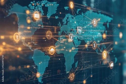 A technologically advanced global network connecting the world through financial transactions and data exchange, highlighting the digital economy's intricate web.