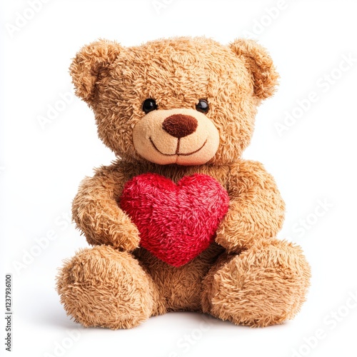 A teddy bear holding a small red heart, isolated on white background for Saint Valentines Day