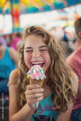 A teenage girl with a mischievous grin giggles as she enjoys a cone of rainbow-colored sherbet with friends at a lively amusement park