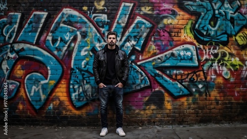 A teenager sprays colorful graffiti on an urban wall, blending street art with an abstract style