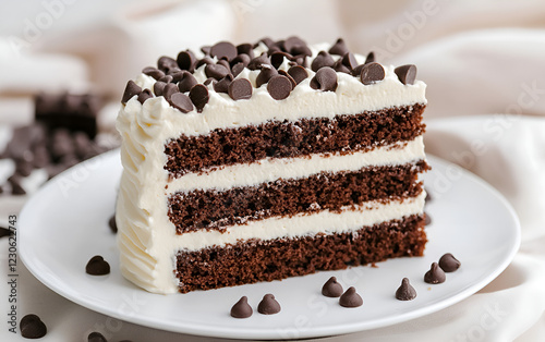 A tempting slice of chocolate chip cake served on a plate, featuring a rich, chocolatey appearance and visible chocolate chips.