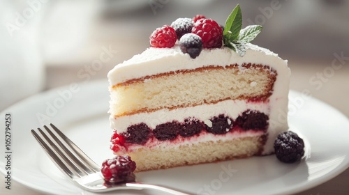 A tempting slice of vanilla cake layered with fresh berries and cream on a white plate, capturing the textures and colors of a delightful dessert treat.