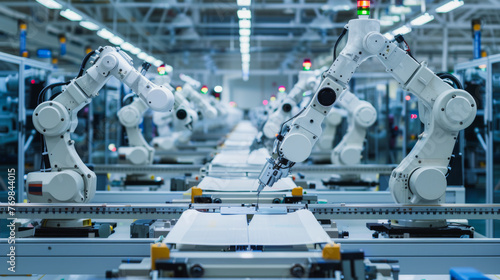 a Textile manufacturing where robots workers winding thread, sewing, stripping