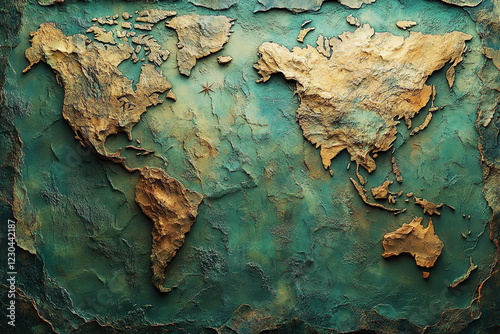 A Textured Golden World Map on a Dark Green Background