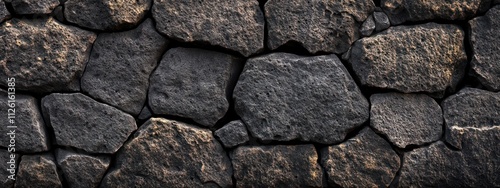 A textured stone wall composed of various shapes and sizes of dark stones.