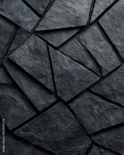 A textured stone wall with irregularly shaped, overlapping dark gray panels creating a geometric pattern.