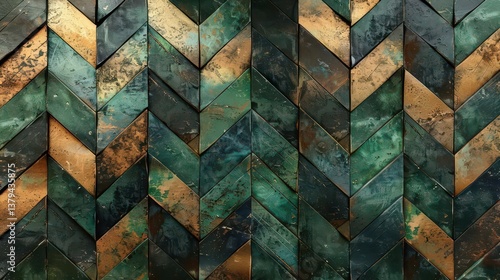 A textured wall featuring a chevron pattern in green and bronze tones.